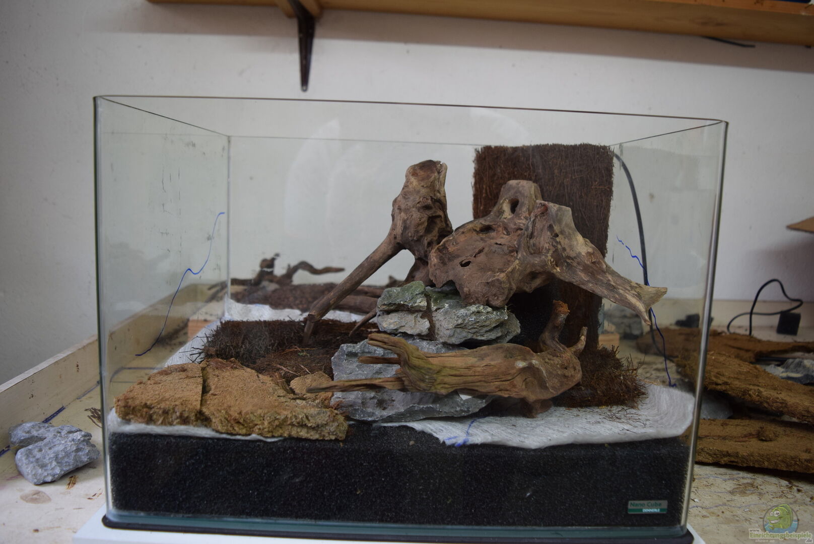 Die Besonderheit bei diesem Becken besteht aus einem Fehlboden, der als Wasserspeicher dient. Der ganze Aufbau steht auf einem Konstrukt aus Lichtstegplatten. Die Technikkammer, wenn man diese so nennen will, ist durch eine eingeklebte Xaximplatte kaschiert. Fliegengitter und Vlies liegen auf den Lichtstegplatten, um so eine Vermischung mit dem Substrat zu verhindern.