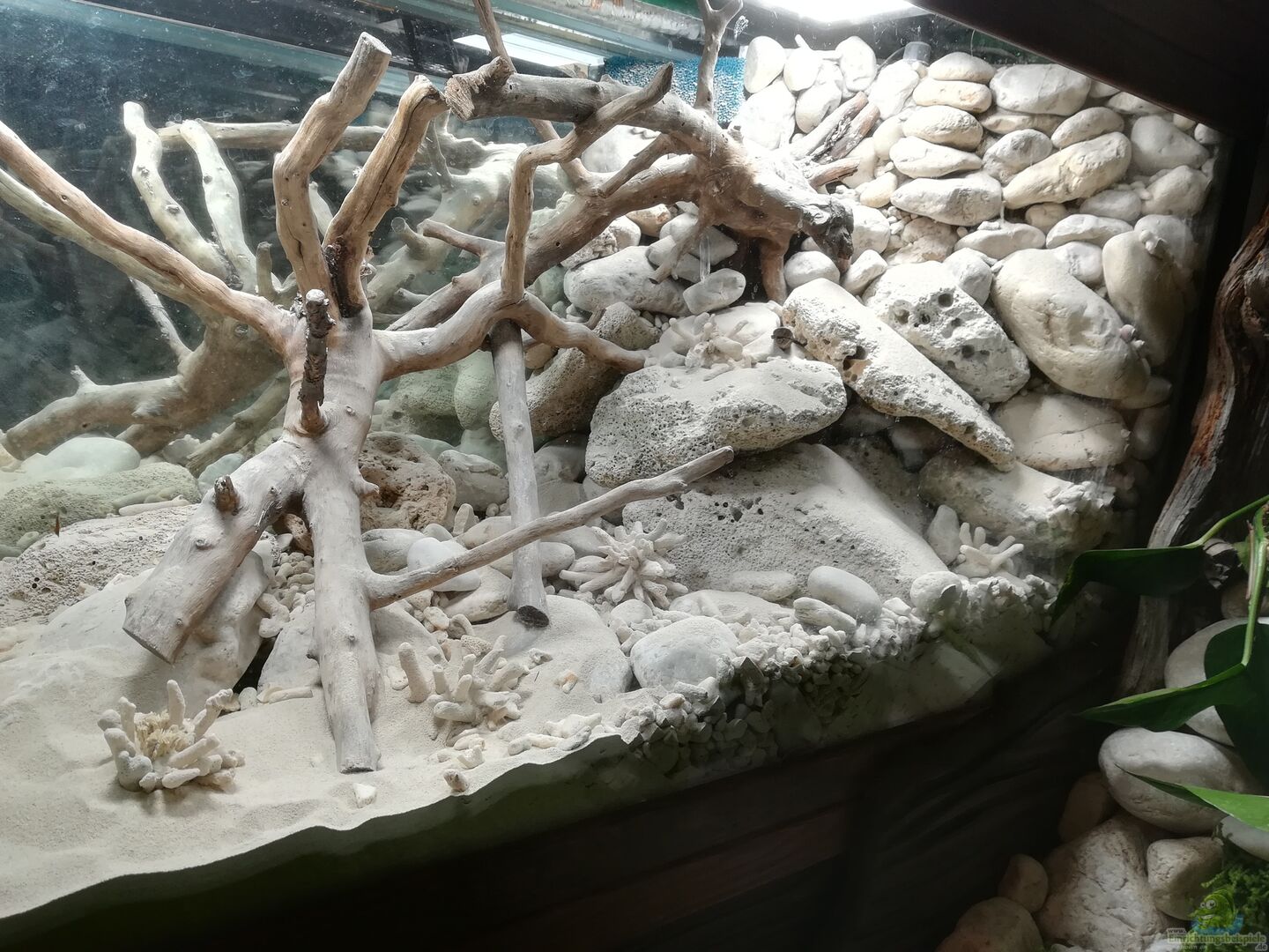 Die Filterkammer befindet sich im Aquarium, hinter dem Steinaufbau. Das Wasser wird von oben in die erste Kammer geleitet, und in der zweiten wieder zurück ins Becken gepumpt. Ein kleines Rohr mit Pumpe befindet sich im Bodengrund, das wiederum Wasser von ganz unten nach oben in die 1.Filterkammer befördert (weiter entwickeltes Jaubert System). In der zweiten Kammer befindet sich auch der Heizstab und zusätzlich noch etwas Filterwatte. Des Weiteren befindet sich auf der Rückseite ein Spiegel, [...]