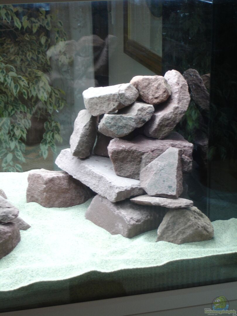 ca. 50-60 kg rötlich brauner Buntsandstein vom Untermain (siehe Fotos). Sehr gut passend zu dem relativ hellen feinen Sand. Um die Bodenscheibe zu schützen, kam eine Styrodurplatte (URSA XPS) drunter. Keinerlei Beeinträchtigung der Flora und Fauna festzustellen!