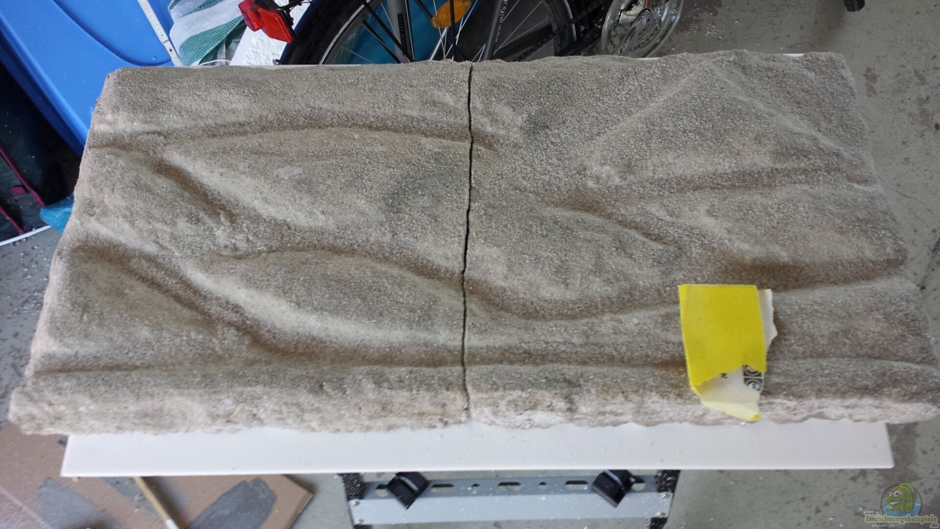 Selbstgebaute 3d-Rückwand aus 8cm Styropor, Flexkleber und Epoxidharz. 2x Lochgestein mit kleinen Höhlen um weitere Unterschlüpfe anzubieten.
