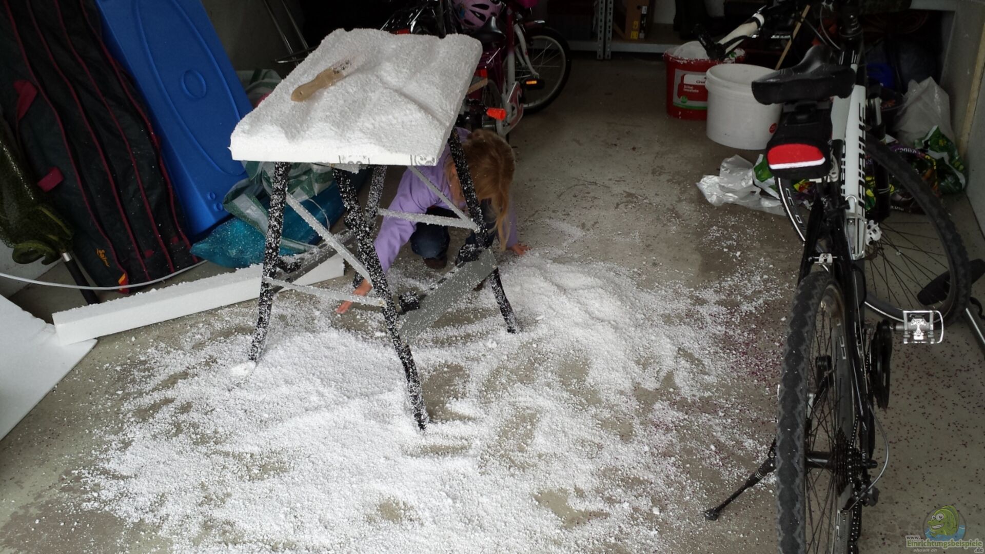 Selbstgebaute 3d-Rückwand aus 8cm Styropor, Flexkleber und Epoxidharz. 2x Lochgestein mit kleinen Höhlen um weitere Unterschlüpfe anzubieten.