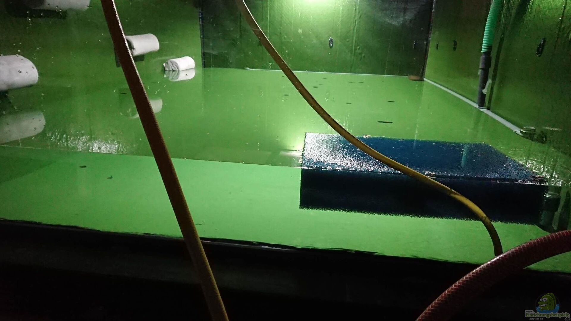 Das Becken besteht aus GFK und einer Frontscheibe. Ein Kellerraum ist durch die Frontscheibe abgetrennt worden und dahinter wurde dann mit Glasfasermatten und Epoxidharz das Becken gebaut. Die Filterung steht oberhalb des Beckens und besteht aus zwei 130cm Filterbecken.