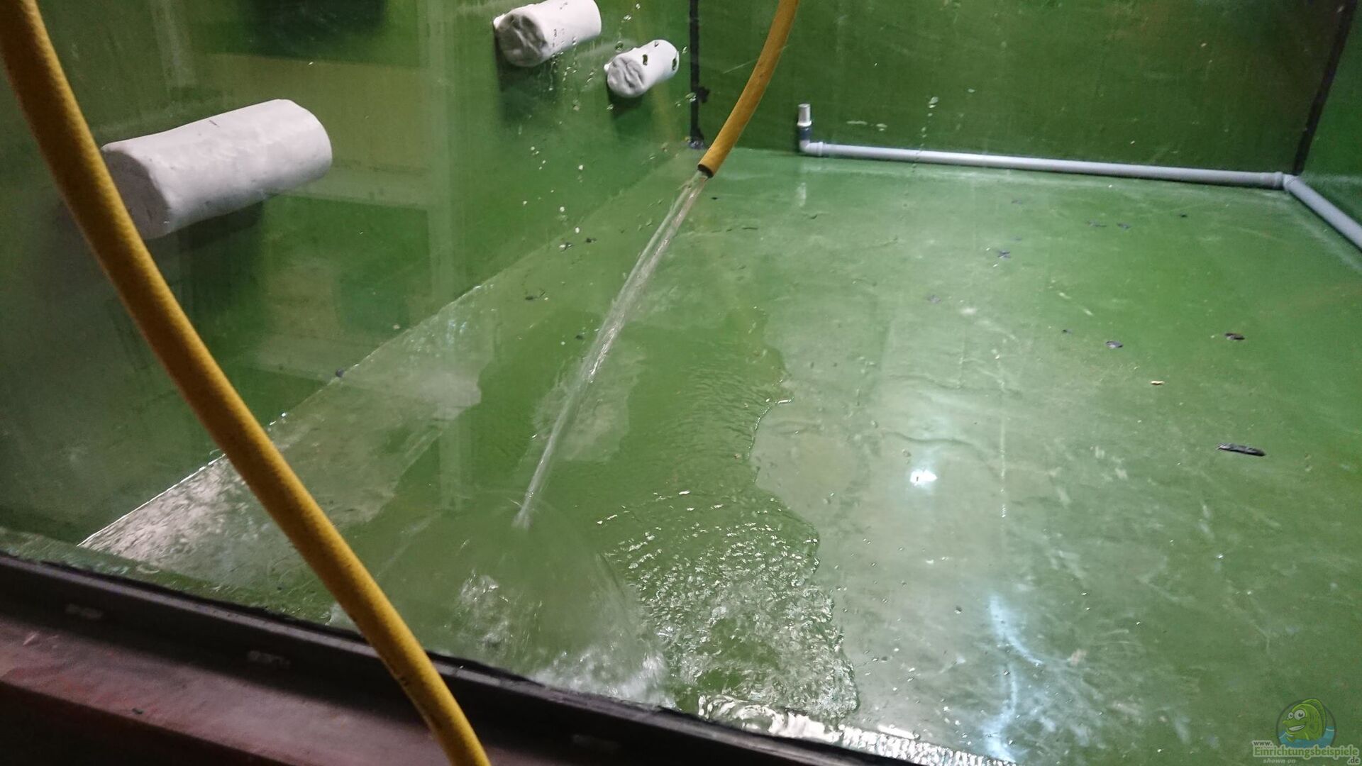 Das Becken besteht aus GFK und einer Frontscheibe. Ein Kellerraum ist durch die Frontscheibe abgetrennt worden und dahinter wurde dann mit Glasfasermatten und Epoxidharz das Becken gebaut. Die Filterung steht oberhalb des Beckens und besteht aus zwei 130cm Filterbecken.