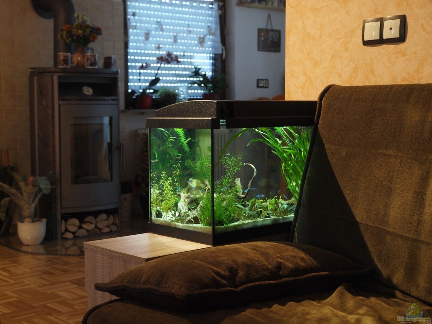 Unser erstes Becken. Komplettset MP Aquapro 60 stehend auf 2mm Thermomatte. Lange beim Hornbach drum herum geschlichen und dann irgendwann einfach mal mitgenommen. Eigentlich sollte es zuerst der Aufzucht von Urzeitkrebsen dienen, aber hierfür läuft nun seit ca. 3 Wochen ein kleines 30er Becken ein.