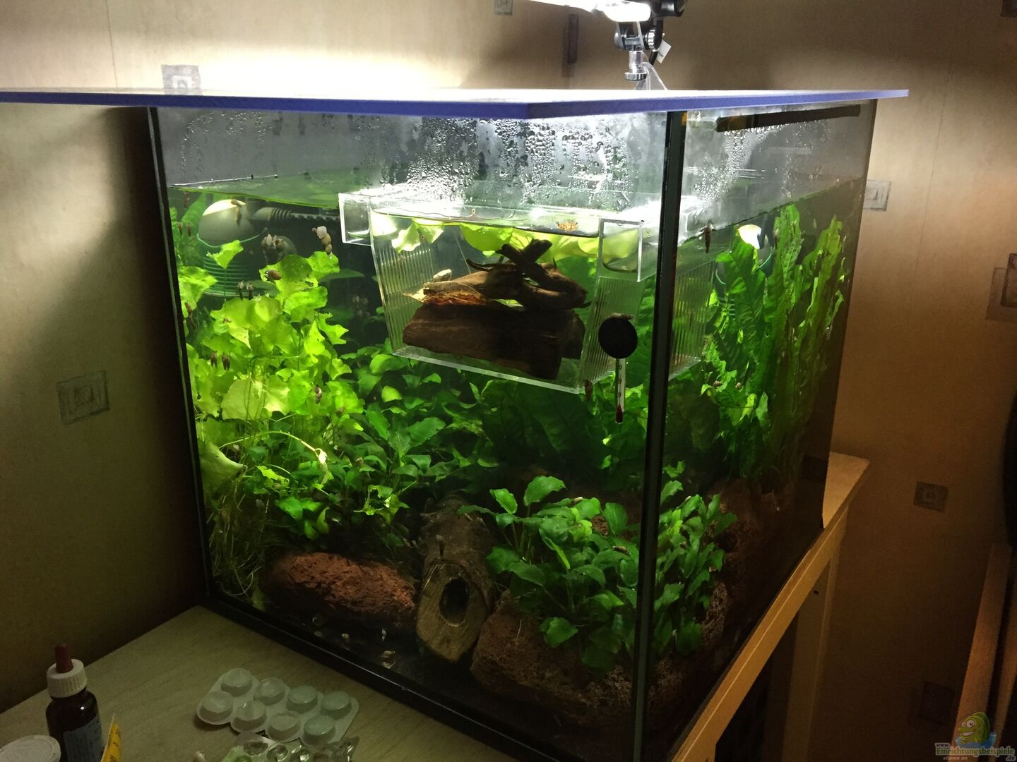 Es handelt sich um ein Standardaquarium ohne Besonderheiten. Die Abdeckung besteht aus einer Plexiglasplatte, die im Zweifel einen Fluchtversuch der Frösche aufhalten soll. Ursprünglich war dies mein Quarantänebecken und die ersten Bewohner, die in Quarantäne gekommen sind, sind sogleich drin geblieben :-D ... also ade Quarantänebecken