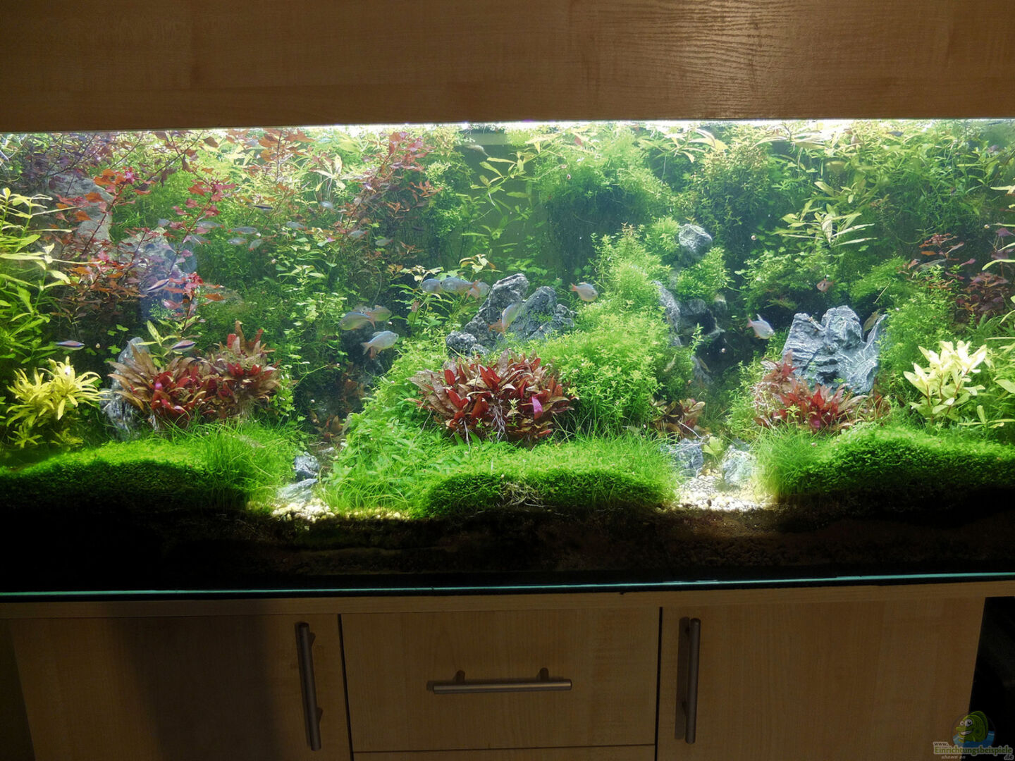 Aquarium 130x60x50 mit geschlossenem Leuchtenkasten in der Farbe des Aquariumschrankes. Aquariumunterschrank mit zwei Türen und drei Schubladen, Farbe Ahorn hell. Habe mich für ein 60 cm breites Becken entschieden, da man damit eine grö??ere Tiefenwirkug erziehlen kann.