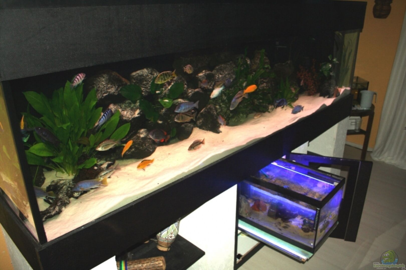 Kompletter Eigenbau der Anlage, Unterbau, Rahmen, Selbstgebaute Abdeckung aus wasserfestem Multiplex, 4 Abdeckplatten, Alu-Schienen in denen die Beleuchtung verschiebbar, oder komplett entnehmbar bleibt... Spezieller 2-Kammer ECK-Mattenfilter, und 60cm Becken als Einschub auf Schublade. Davor eine Tür mit Ausschnitt, dass man die Jungfische im kleinen Becken auch betrachten kann..