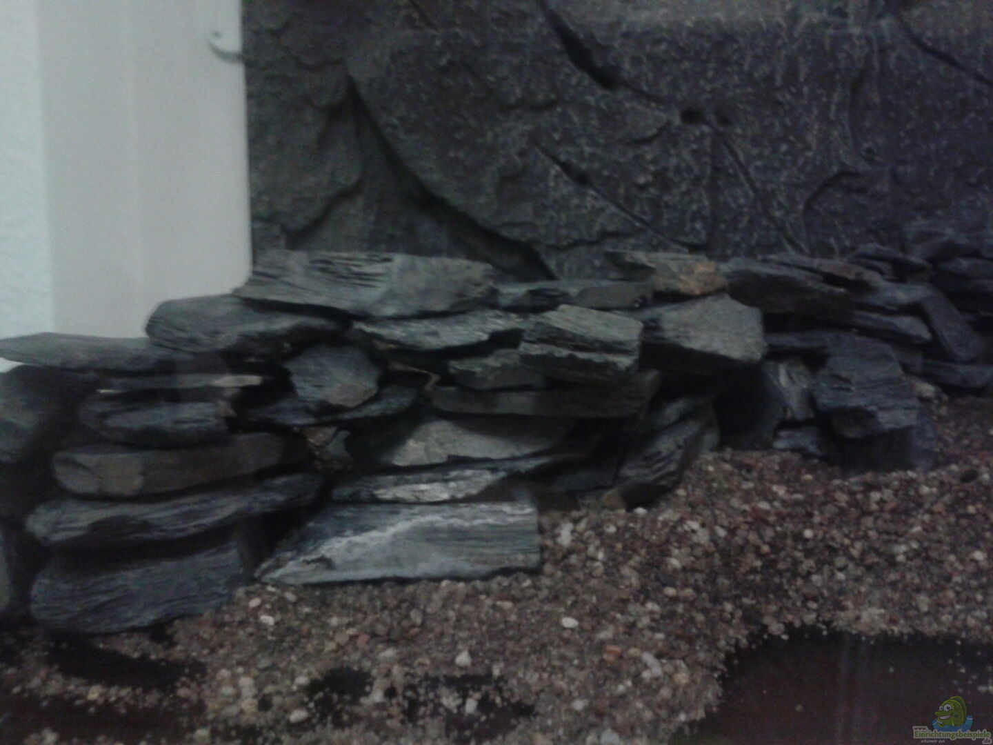Eine gro??e Mangrovenwurzel. Sie sieht aus wie ein Tor/Bogen und hat ungefähr die Ma??e 70x50 (LxH). - eine Juwel Stone Ganite Rückwand - eine selbstgebastelte Schieferterrasse mit kleinen Verstecken und Nischen in der linken oberen Ecke des AQ.