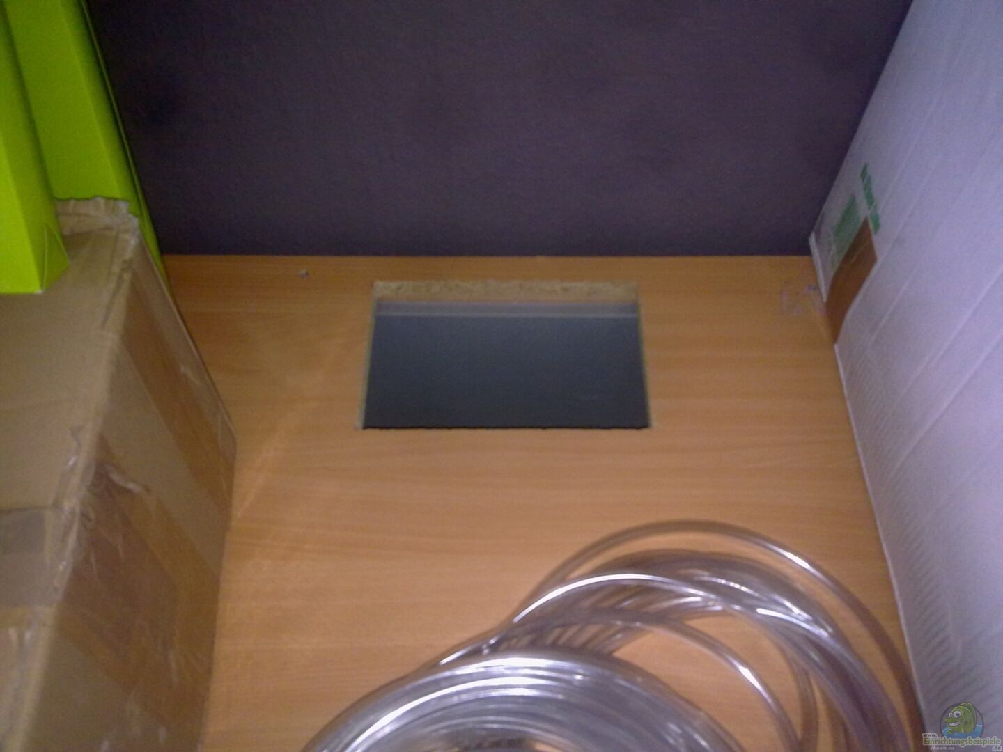 Becken Das Becken wurde am 29.06.2012 bei MAT (Meyer Aquarien Technik) aus Klein Lafferde bestellt. Es ist sto??verklebt mit Sicherheitsinnennaht und 12mm Glas. Au??erdem hat es 2 40er Bohrungen und einen 20x20 cm ??berlaufschacht. Zur Stabilität hat das Becken 2 Seitenstreben und eine Mittelstrebe. Die Lieferung erfolgte am 21.09.2012. Am nächsten Tag wurde es dann zu 4. in den ersten Stock getragen. Um es besser tragen zu können, wurde es mit der Bodenplatte nach oben zeigend getragen. [...]