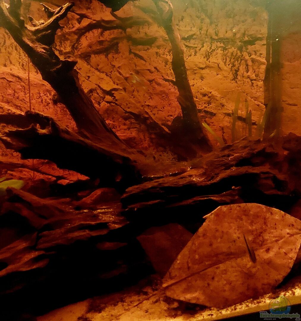 15x Moorkienwurzeln: Damit erfolgte die Nachbildung eines ins Wasser gefallenen großen Astes (rechte Seite). Sowie die Nachbildung eines kleinen Baumstamms (linke Seite) 1x großer Stein Seemandelbaumblätter: Schwankende Anzahl in unterschiedlichen Größen. Verleihen dem Aquarium ein natürliches Aussehen. 2x Rückwand JUWEL Cliff dark
