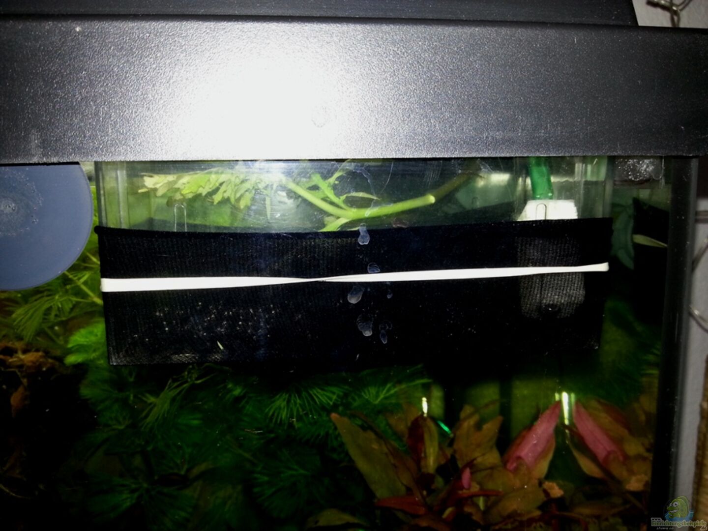 Das Becken ist ein Standardbecken 54 Liter. Die Rückwand ist komplett selber gebaut aus einer 80 mm Styroporplatte, teilweise hinterschwimmbar und hat viele kleinere Höhlen. Die Platte ist dann ins Becken eingearbeitet wurden. Ausgearbeitet und mit Kies und Epoxidharz dunkelgrün und braun versiegelt