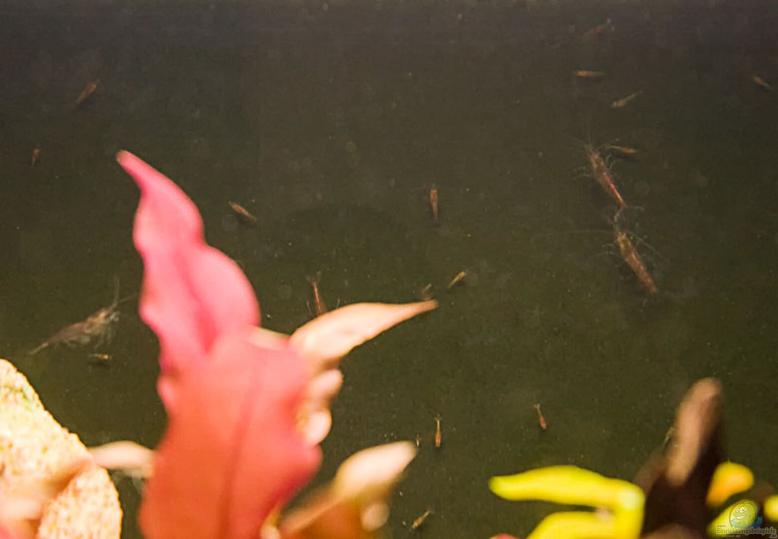 etwa 45 Neocaridina heteropoda (Red Fire/Cherry) Ich versuche den Bestand so zu halten. Habe schon einige 100 weggegeben. Aber die vermehren sich wie die Karnickel, ein gutes Zeichen für meine Pflege. Ich gebe ständig welche weg, und behalte immer so 40 bis 50 Jugendliche.