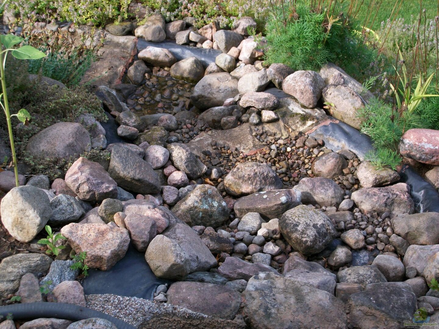 Teich mit Sumpfzone, Bachlauf und kleinem Wasserfall Der Teich wird stufenartig tiefer. Es gibt 4 Tiefenstufen. Der tiefste Bereich ist vorne mittig. Der Teich wird von 2 Seiten von einer Feldsteinmauer begrenzt, an den anderen beiden Seiten grenzt er an Rasenfläche. Der Bach verläuft durch einen Steingartenberg, der bis zum Wasserfall eine Höhe von ca. 1, 5 Meter hat. ??ber den Bach führt eine Treppe zur Terrasse; der Bach wird darunter durch ein Rohr geleitet.