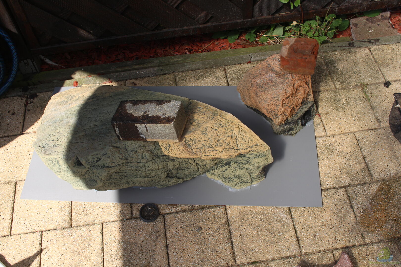 Hauptsächlich Back to nature Module, die ich teilweise durch geschnitten habe. diese schaffen so Versteckmöglichkeiten. Die Module wurden entweder auf Marmorplatten geklebt oder auf PVC Platten, die dann mit grossen Steinen beschwert worden sind. Alle Module habe ich im Laufe der letzten Jahre gebraucht gekauft, bzw. aus meinem alten 160 cm Becken entnommen. Zusätzlich liegen weitere Steine im Becken, die ich im Garten gesammelt habe.