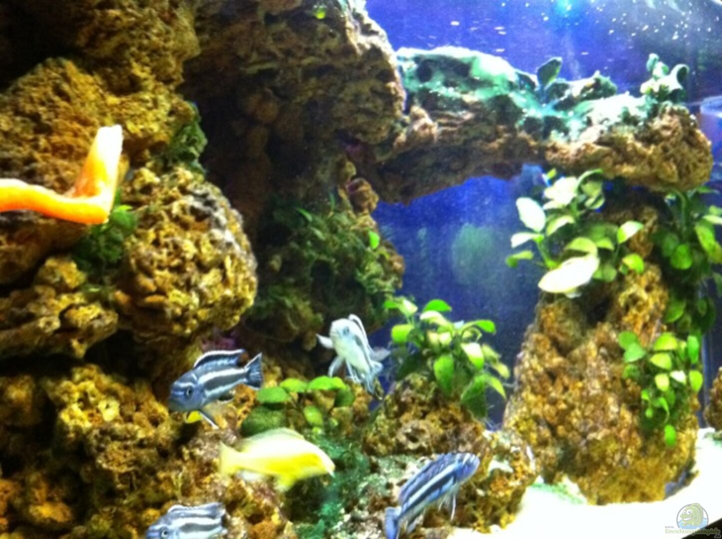 Becken von Uka Aquarienbau, sto??verklebt. Keine Querstreben. Unterbau: verzinkte 40x40x4mm Stahlrahmenkonstruktion 90x90x57cm, verkleidet durch Spanplatten mit Melaminbeschichtung und Dickkante (5mm Bodenfreiheit um Aufquellungen vorzubeugen). ´Integrierte´ Kiesblende durch ??berstand der o.g. Platten von ca. 4-5 cm. 2 Seitenscheiben als Sichtseiten; 2 Seitenscheiben von aussen schwarz gestrichen.