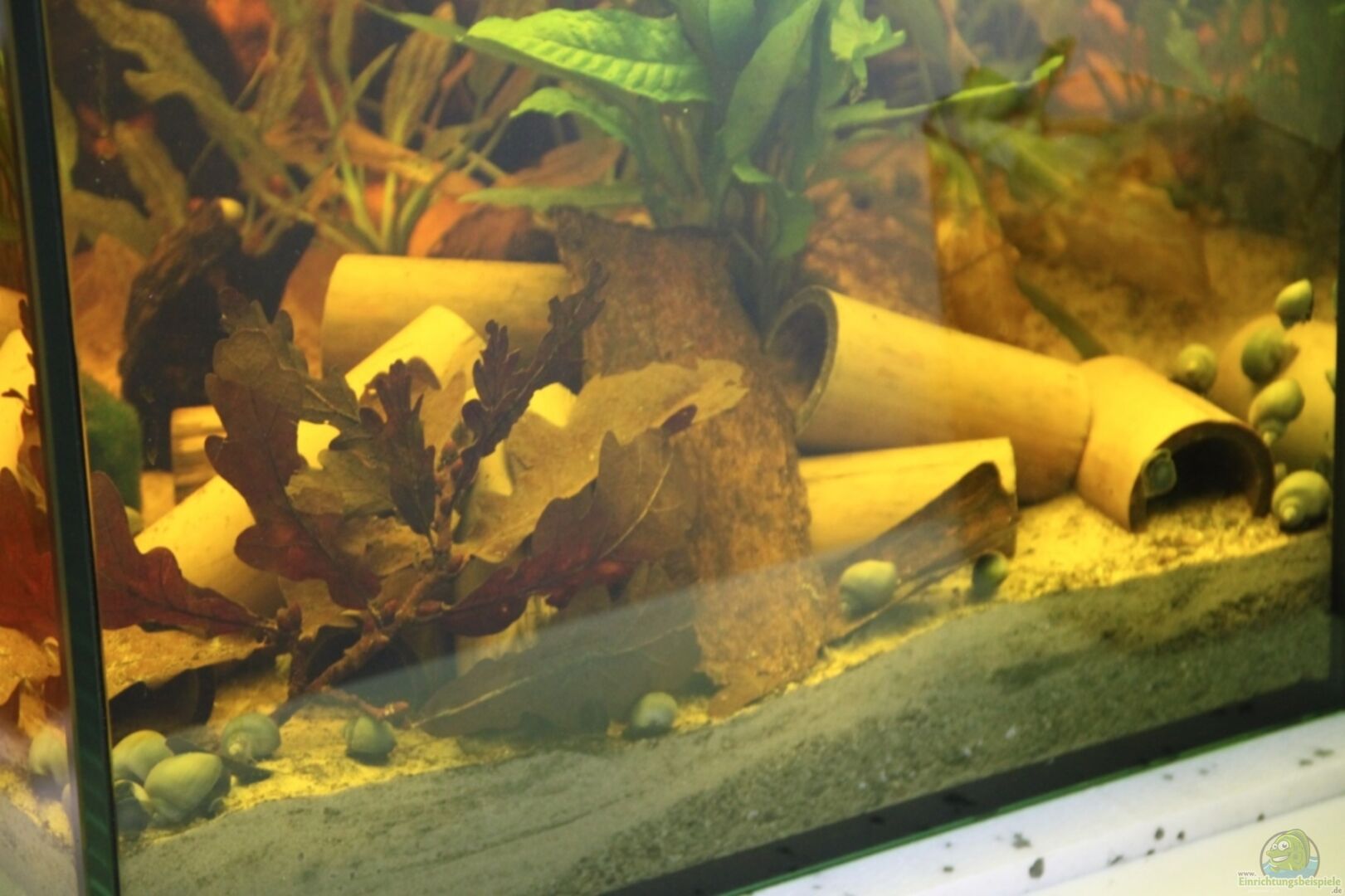 grosse und kleine Wurzeln, Kokosschalenhöhlen, Bambusröhren, Plantanenrinde, 1 Moosball, Steine aus dem Bach, immer mal wieder etwas Laub