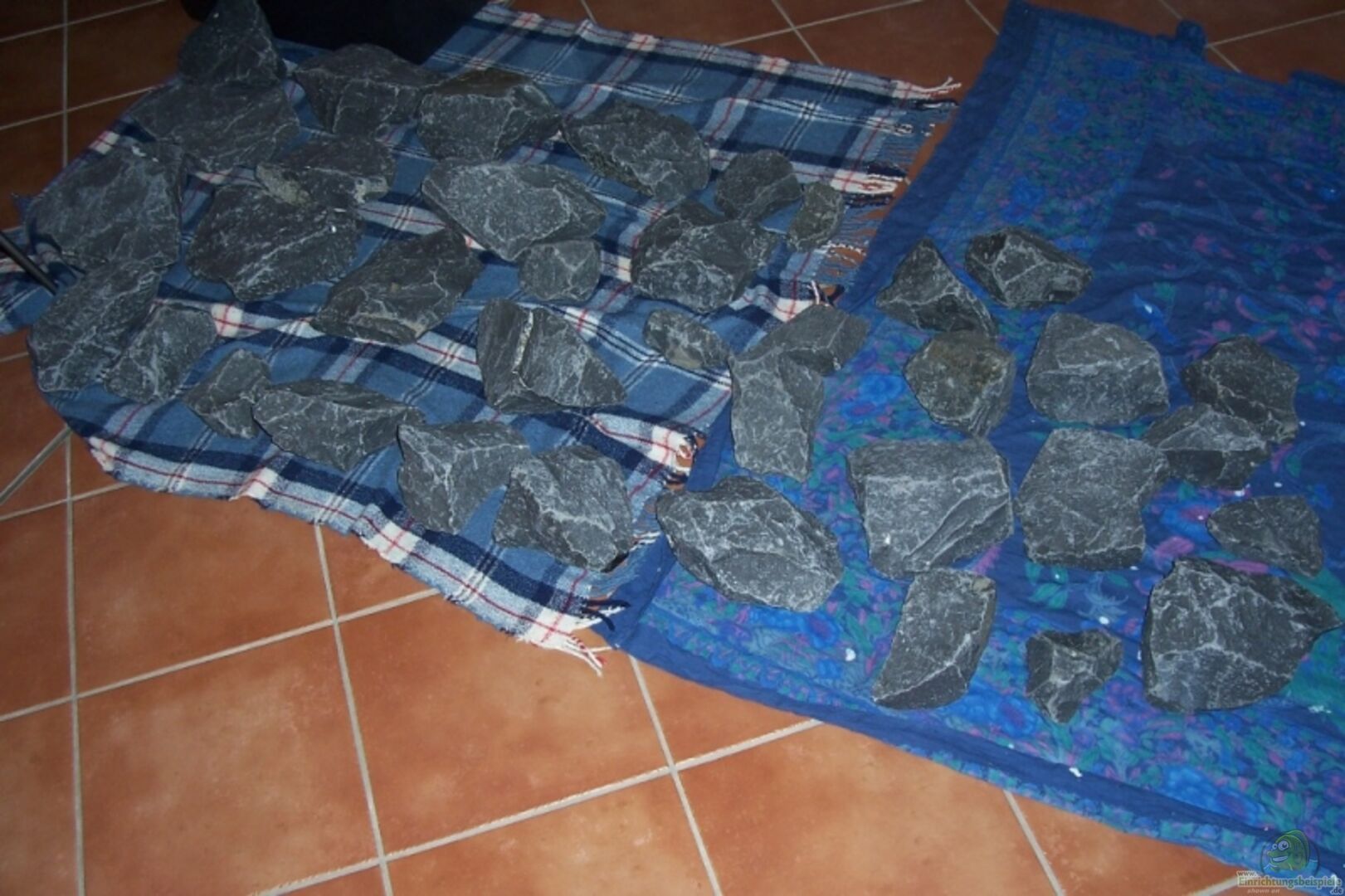 ca. 60 kg dunkler Basaltbruch Die ganze Einrichtung steht auf einer 2 mm Plexiglasscheibe 3 D Rückwand Felsen 150/60 Felsvorsprünge ca. 1-4 cm , sieht auf den Fotos sehr braun aus , ist im Orginal aber nicht wirklich so braun ......