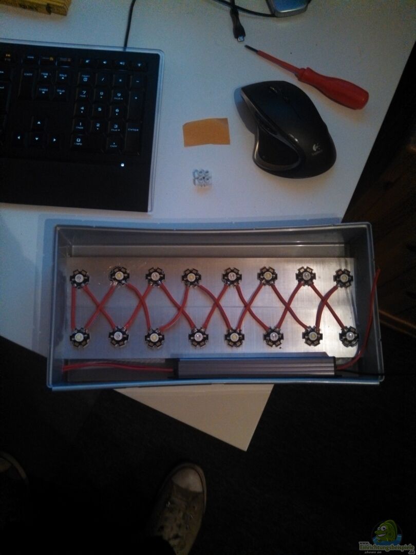 -Instant Ocean Salz von Aquarium Systems - ATI Salz -100 Watt Heizstab (einstellung auf 24°C) aus altem Boyu geklaut -Spindel mit Thermomenter von Aqua Medic -Steht auf Schreibtisch mit Schaumstoffunterlage -Schwarze Rückwandfolie