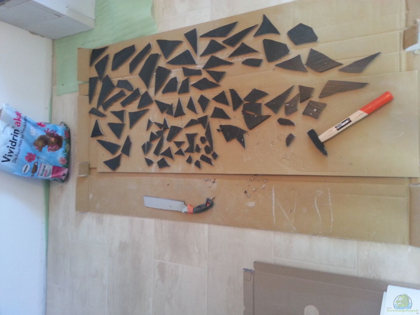 Der Unterbau ist aus Ytongsteinen, schwarz geflie?? gebaut worden. Dieser ist dann mit schwarzen Fliesen verkleidet, die ich in mühseliger Arbeit in kleine Bruchstücke zertrümmert habe. Eine flächige Verkleidung wollte ich nicht. Für die Stellfäche des Beckens habe ich selbstveständlich komplette Fliesen verarbeitet. Das Ganze ist dann mit wei??er Fugenmasse verfugt worden. Es sollte etwas besonderes werden. das Ergebnis gefällt mir sehr gut.