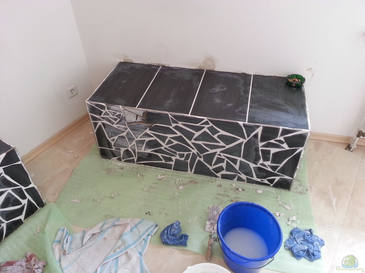 Der Unterbau ist aus Ytongsteinen, schwarz geflie?? gebaut worden. Dieser ist dann mit schwarzen Fliesen verkleidet, die ich in mühseliger Arbeit in kleine Bruchstücke zertrümmert habe. Eine flächige Verkleidung wollte ich nicht. Für die Stellfäche des Beckens habe ich selbstveständlich komplette Fliesen verarbeitet. Das Ganze ist dann mit wei??er Fugenmasse verfugt worden. Es sollte etwas besonderes werden. das Ergebnis gefällt mir sehr gut.