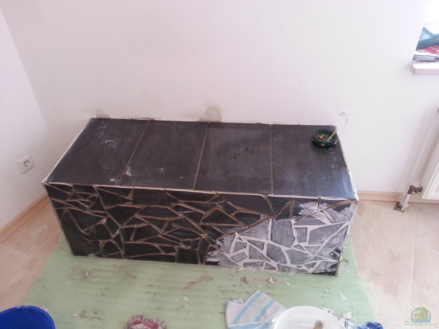 Der Unterbau ist aus Ytongsteinen, schwarz geflie?? gebaut worden. Dieser ist dann mit schwarzen Fliesen verkleidet, die ich in mühseliger Arbeit in kleine Bruchstücke zertrümmert habe. Eine flächige Verkleidung wollte ich nicht. Für die Stellfäche des Beckens habe ich selbstveständlich komplette Fliesen verarbeitet. Das Ganze ist dann mit wei??er Fugenmasse verfugt worden. Es sollte etwas besonderes werden. das Ergebnis gefällt mir sehr gut.