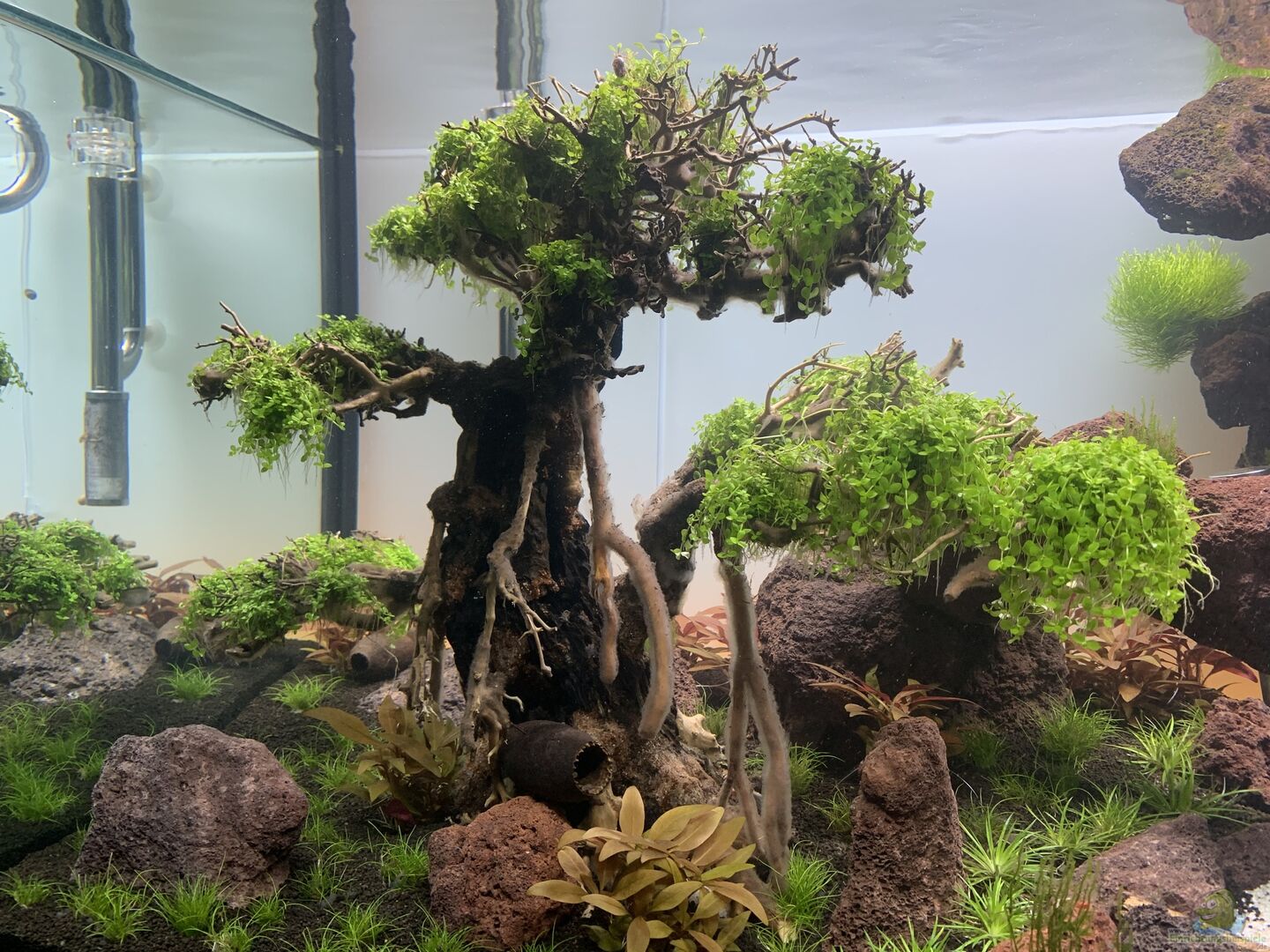 Steinaufbau mit Lava-Steinen(verklebt) selbstgebauter Sandfall zwei Bonsai-Bäume mit "Monte Carlo" bepflanzt