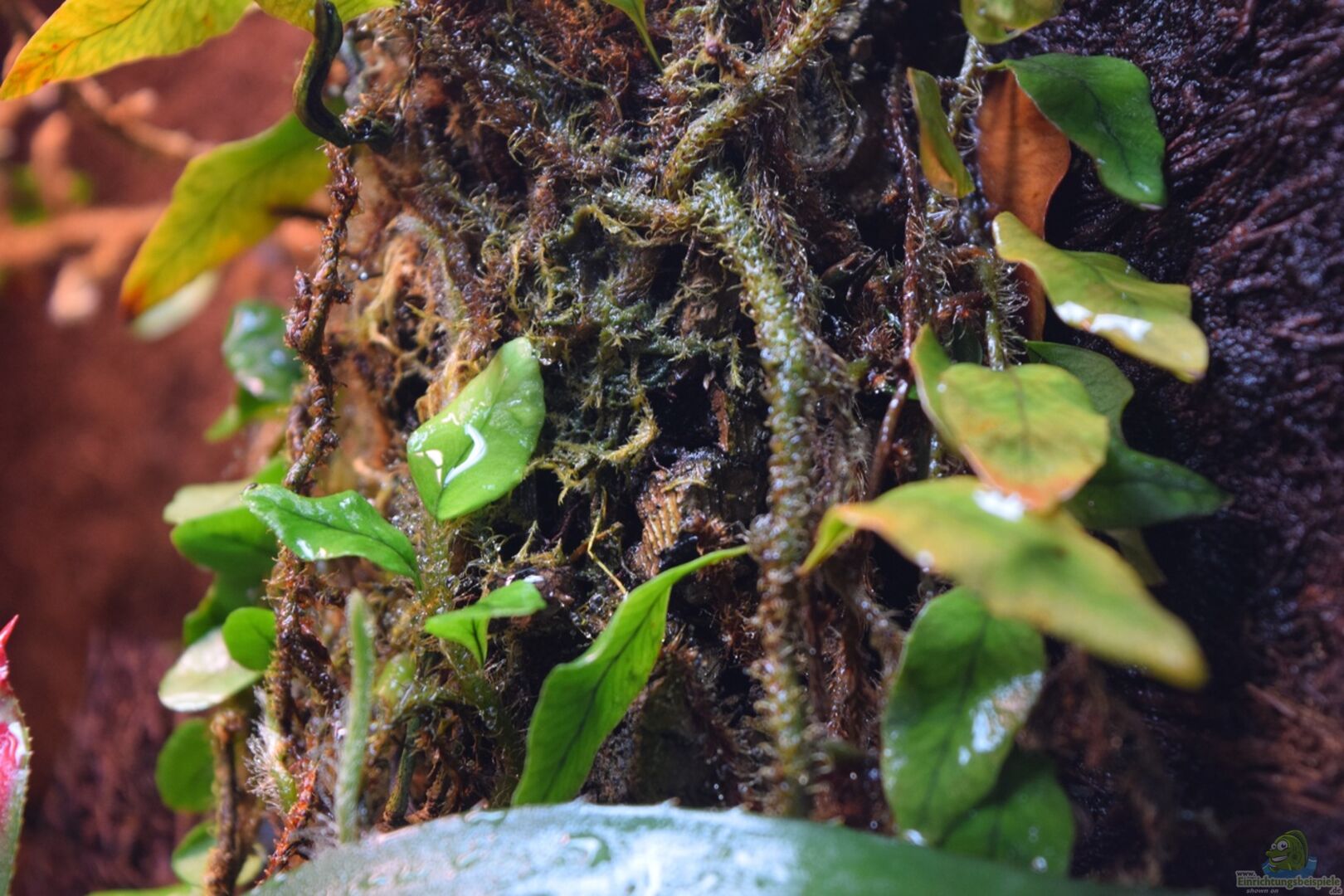 Schwimmpflanzen: Lemna minor, Limnobium laevigatum Wasserpflanzen: Ceratophyllum demersum, Echinodorus x Regine Hildebrandt, Anubias barteri Nana, Acorus gramineus Moose: Riccia fluitans, Taxiphyllum barbieri, Monosolenium tenerum Landpflanzen: Barbosella cucullata, Biophytum sensitivum, Begonia bowerae, Episcia dianthiflora, Ficus scandens, Neoregelia fireball, Neoregelia pauciflora, Neoregelia Red spottet, Peperomia, Ficus borneo, Selanginella spec, Ficus quercifolia