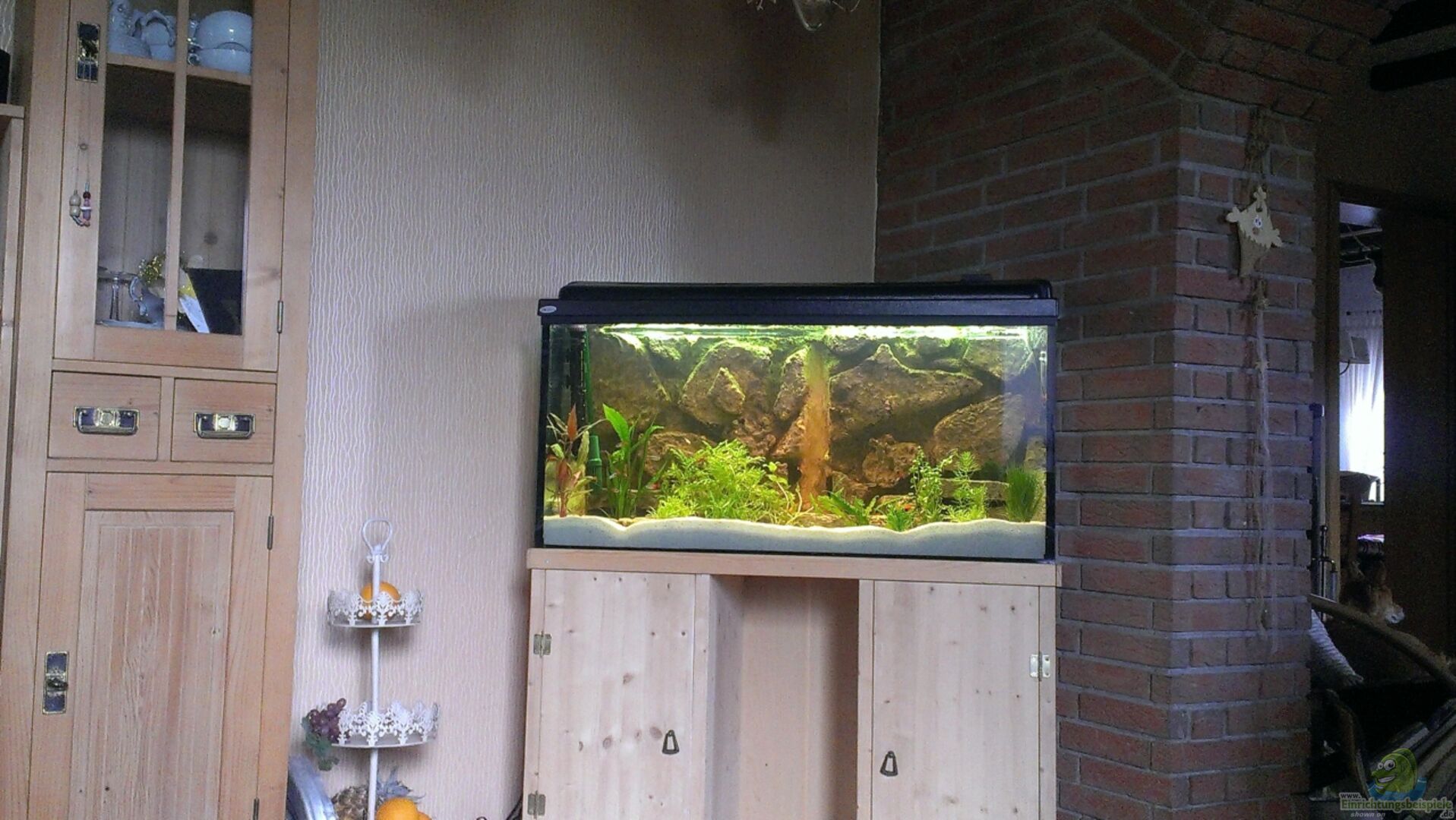 Ansich hat es keine Besonderheiten, das einzige ist die Rückwand und ein teil des Bodens. Es ist aus Styropor und Kunststoff angefertigt und mit Grauerfarbe gestrichen. Am Boden wurden damit 3 Hölen angefertigt. Die Struktur der Rückwand soll eine Fels (Stein) wand darstellen. Der Aquarienschrank wurde selbstgebaut aus Fichtenholz. Er hat 2 Türen (links und rechts)