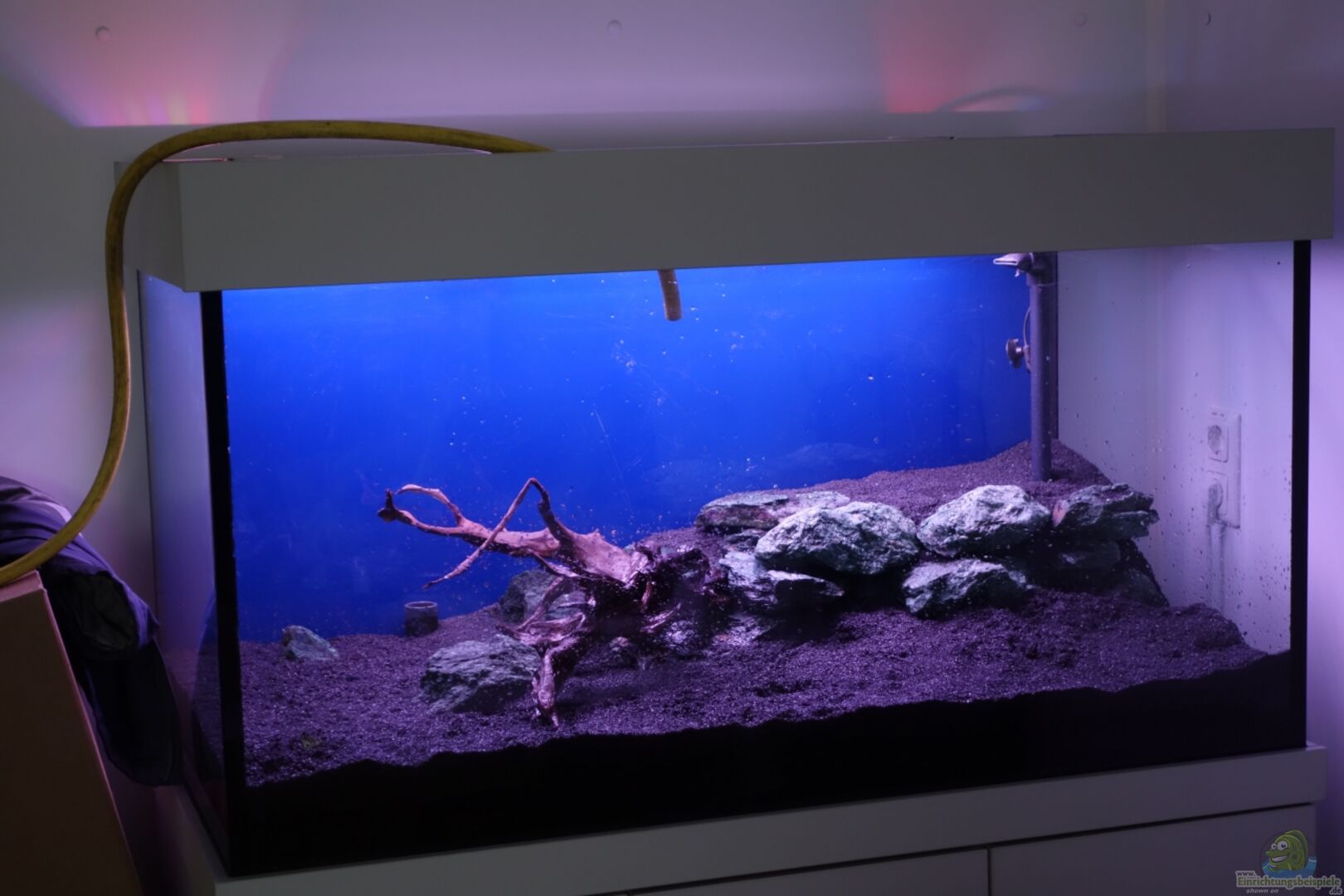 Umzug des Beckens am 25.01.2013 an seinen neuen Platz. Beginn der Neueinrichtung des Becken am 01.02.2013 Anfertigung des Becken durch meinen Händler Fischer Fische in Schwieberdingen im Jahr 2007 mit 12 mm Floatglas. Verrohrung PVC durch die Bodenscheibe. Unterschrank und Blende als Anfertigung durch meinen Freund.