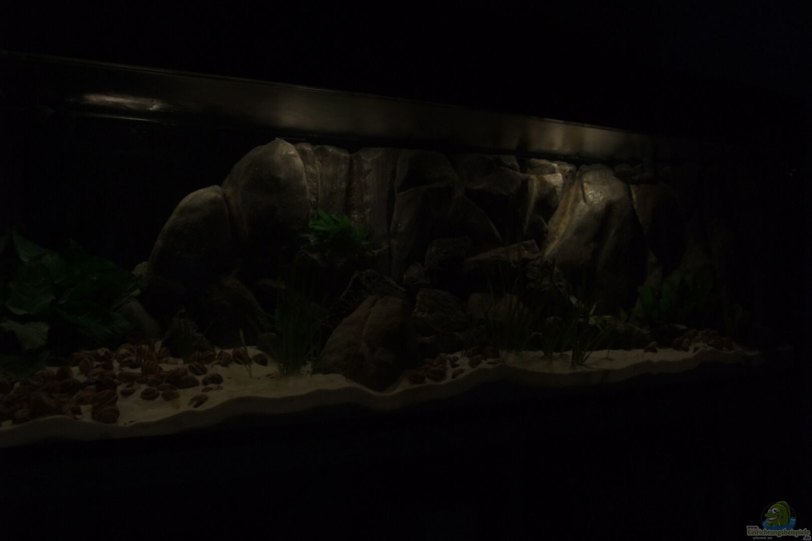 Hinten rechts doppelwandiger ??berlaufschacht mit einstellbarem Kamm für oben und 4 Gitter weiter unten für den Wasseraustausch im Bodenbereich. Bohrungen im Aqua-Boden für Ablauf nach unten und Einlauf zur Wasserrückführung. Aquarium Sto??- und Wulsverklebt. Frontscheibe aus Floatglas. Alle Scheiben sind 12mm dick.