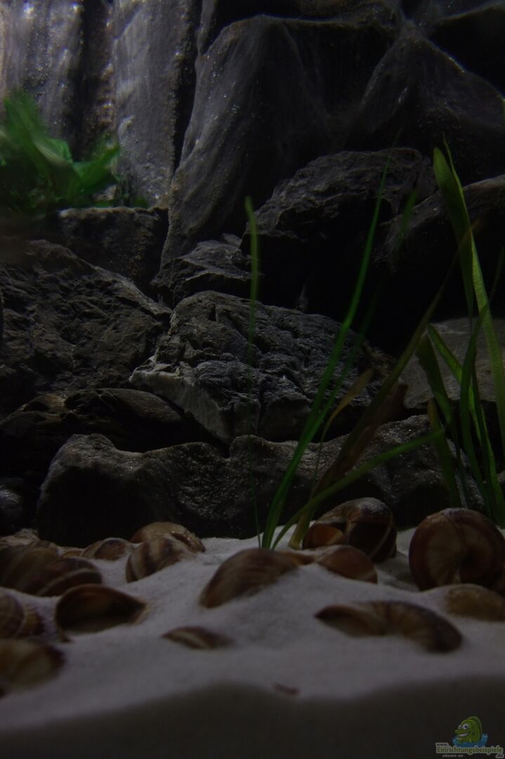 Hinten rechts doppelwandiger ??berlaufschacht mit einstellbarem Kamm für oben und 4 Gitter weiter unten für den Wasseraustausch im Bodenbereich. Bohrungen im Aqua-Boden für Ablauf nach unten und Einlauf zur Wasserrückführung. Aquarium Sto??- und Wulsverklebt. Frontscheibe aus Floatglas. Alle Scheiben sind 12mm dick.