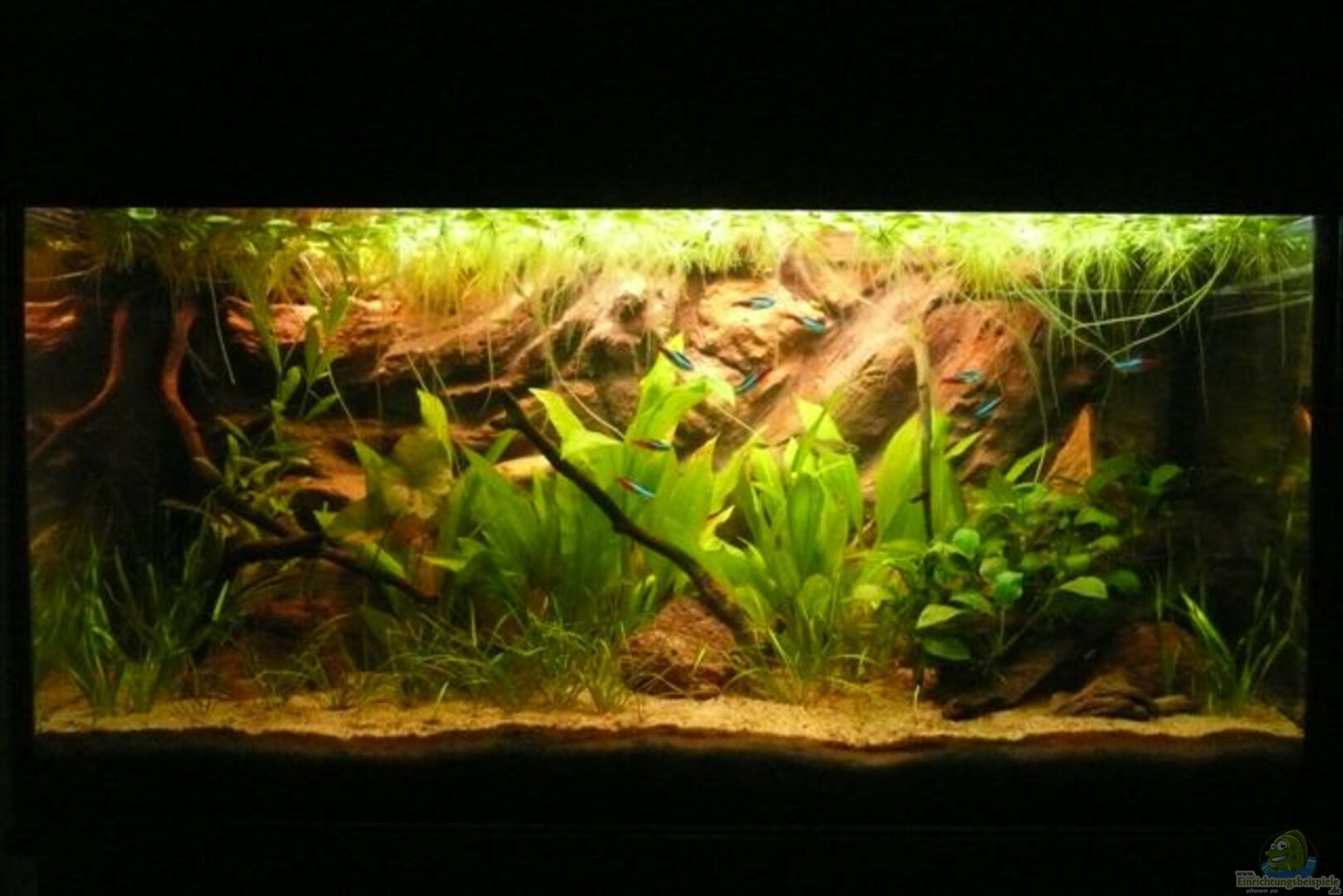 Durch die Eigenbau-Rückwand wurde die gesamte Technik versteckt. Es befinden zwei Wasserausläufe in der Rückwand. Eine davon ist in Bodennähe angebracht um für die Panzer-und Hexenwelse eine Strömung zu erzeugen. Dieser Platz wird von den Fischen sehr gerne aufgesucht.