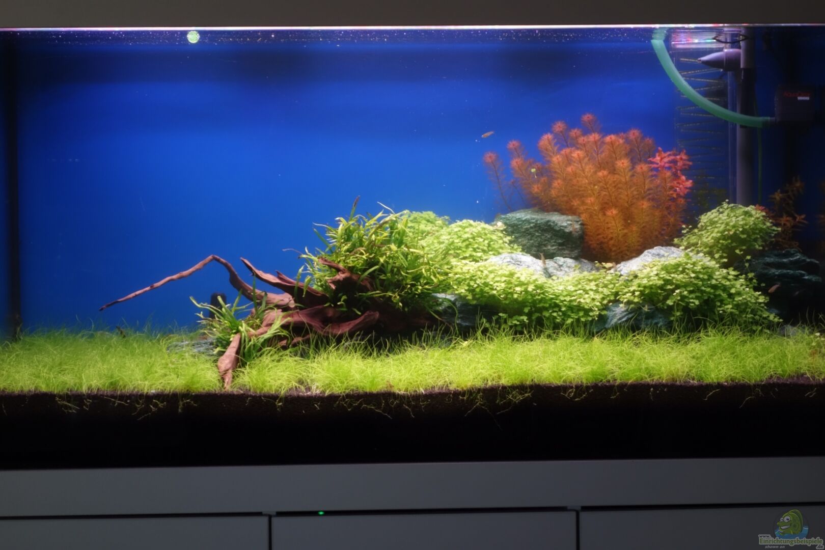 Umzug des Beckens am 25.01.2013 an seinen neuen Platz. Beginn der Neueinrichtung des Becken am 01.02.2013 Anfertigung des Becken durch meinen Händler Fischer Fische in Schwieberdingen im Jahr 2007 mit 12 mm Floatglas. Verrohrung PVC durch die Bodenscheibe. Unterschrank und Blende als Anfertigung durch meinen Freund.