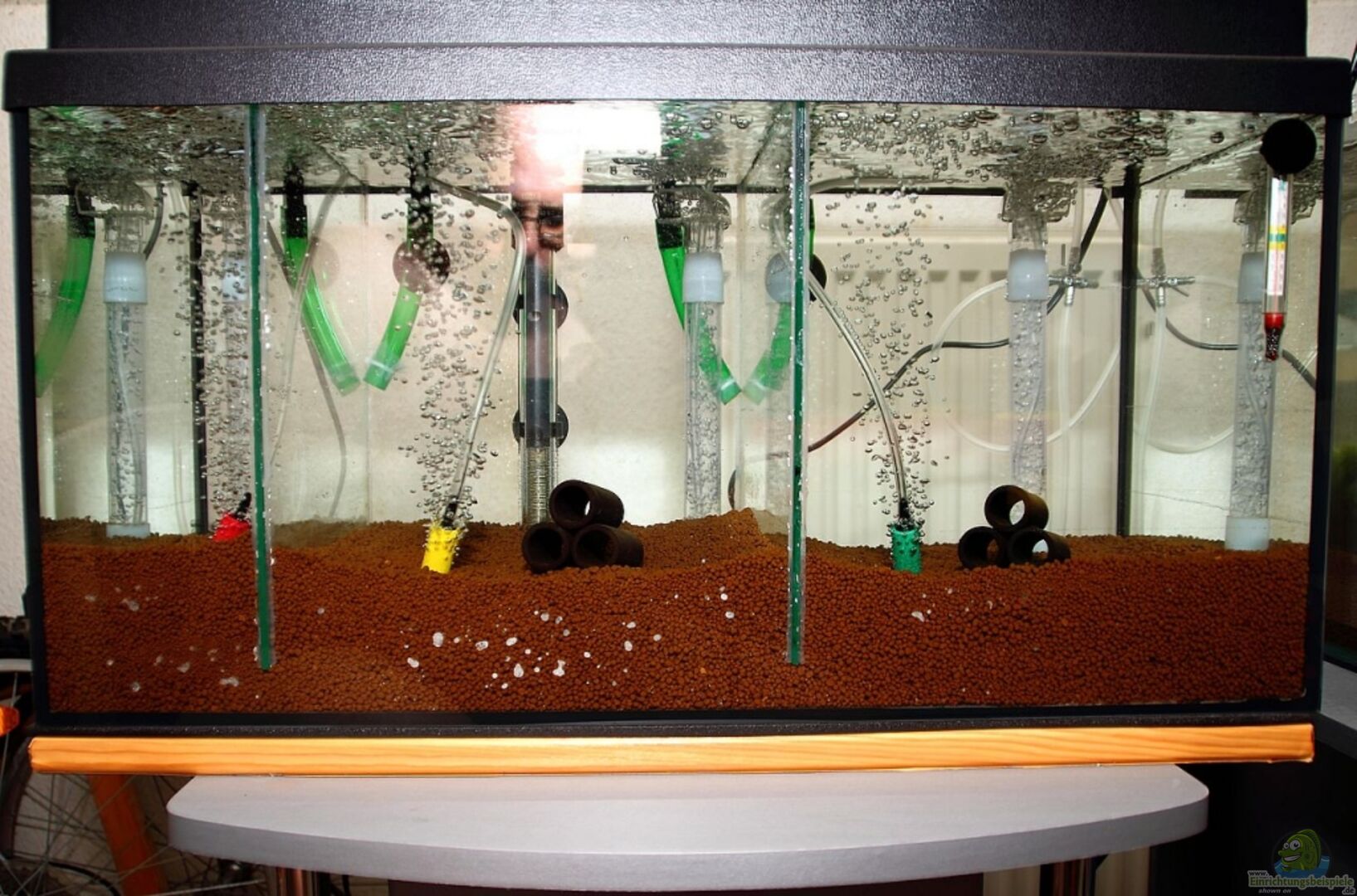 - Artenbecken - Züchterbecken Das Becken selbst ist ein handelsübliches 54er Becken von Tetra (kein AquaArt!), in welches ich zwei Glasscheiben zur Trennung eingeklebt habe. Die Trennung verläuft jedoch nur oberhalb des Bodenfilters, sodass das ganze Becken ein verbundenes Bodenfiltersystem hat. Somit habe ich über den Bodengrund ein Filtersystem mit 8 Litern Volumen auf (Rest/netto) 46 Liter Wasser. Auch habe ich die durch die Scheiben getrennten Beckenteile mit U-förmigen Schlauchsystemen [...]