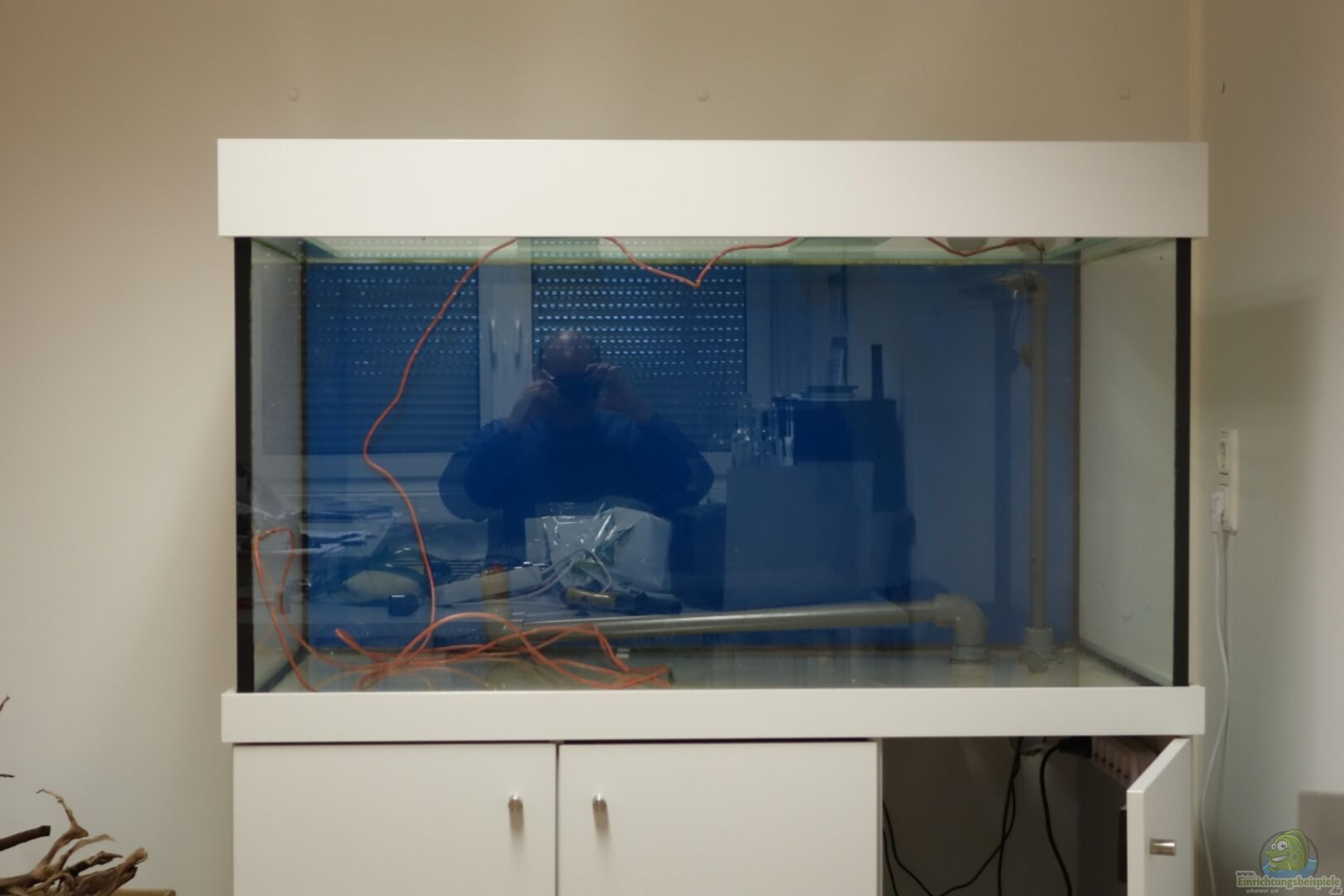 Umzug des Beckens am 25.01.2013 an seinen neuen Platz. Beginn der Neueinrichtung des Becken am 01.02.2013 Anfertigung des Becken durch meinen Händler Fischer Fische in Schwieberdingen im Jahr 2007 mit 12 mm Floatglas. Verrohrung PVC durch die Bodenscheibe. Unterschrank und Blende als Anfertigung durch meinen Freund.