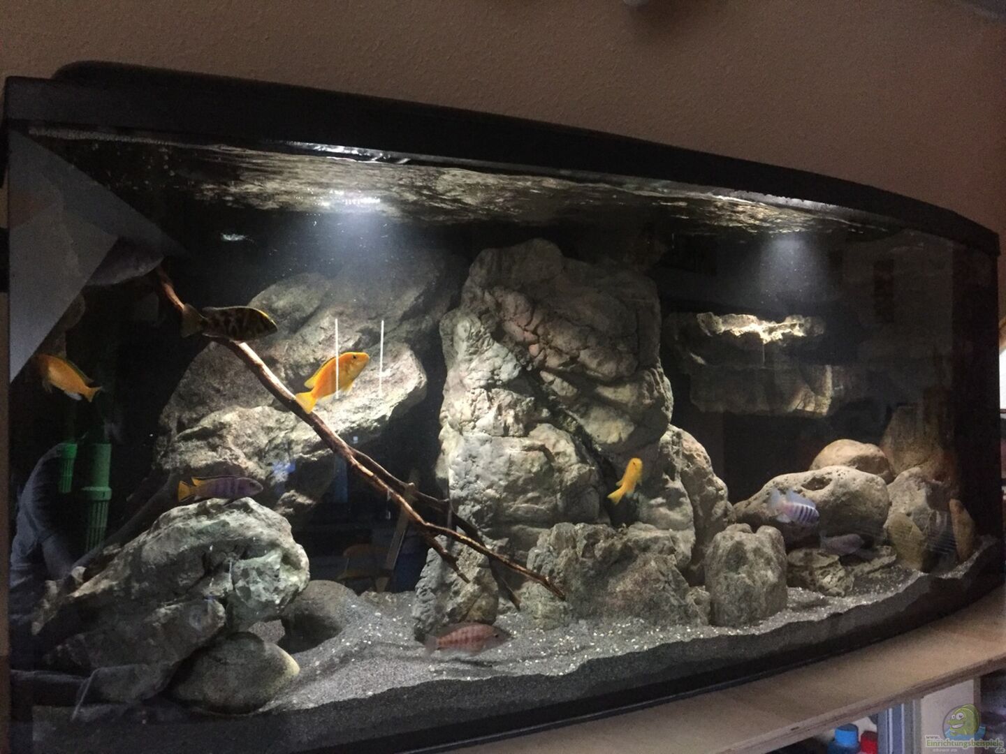 Das Becken ist ein Panorama Aquarium von AquaTec Pausa. Es hat 2 Längs- und 1 Querstrebe. Die Glasstärke beträgt 12mm. Es wurde neu gekauft da mein altes 300l Becken ein Leck hatte und das Wasser sich schön in der Wohnung verteilt hatte. Nach der Bestellung des neuen Beckens musste ich einen Statiker bestellen, da ich mir nicht sicher war ob die Deckenbelastung des Altbaus stand hält...aber alles super. Das Aquarium steht auf einer Schaumstoffmatte und im inneren ist der Boden des Aquariums [...]