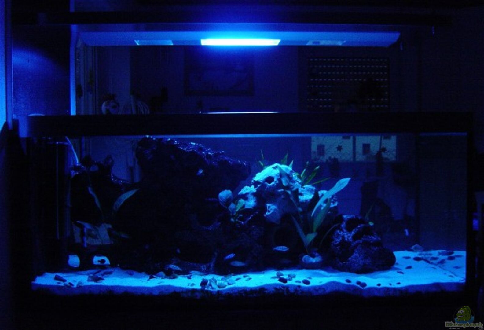 Das Aquarium ist eine Sonderanfertigung und dient als Raumteiler. Der obere Rand des Beckens ist mit einem V4A Edelstahrahmen eingefasst. Als ich 1998 mein Haus baute wurde alles gleich mit eingeplant. Das Becken ist gebohrt und am Hausabfluss und Hauswasseranschluss über eine Thermostatbatterie angeschlossen. Der Schrank ist gemauert und verklingert. ??ber eine Edelstahlklappe ist die Technik zu erreichen.