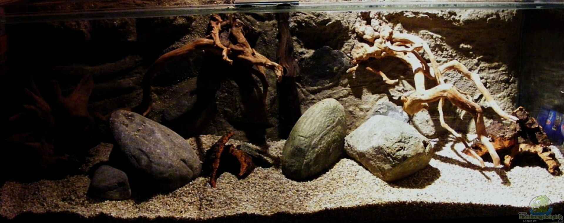 Steht auf selbstgemachtem Rahmen aus 40er Profilrohr(siehe Bild)dazu MDF-Platte und zwei Lagen Schaumstoffmatte 3mm Rückwand Selbst-Herstellung Diese besteht aus zwei Hälften und wird mit Feinstsand behandelt, um eine Uferlehm-Schicht zu bekommen Das Becken wird offen betrieben, welches die Möglichkeit ergibt mit Pflanzen zu agieren, wie man sie von den Randbepflanzungen aus den Biotopen her kennt. Dazu mehr unter sonstiges.