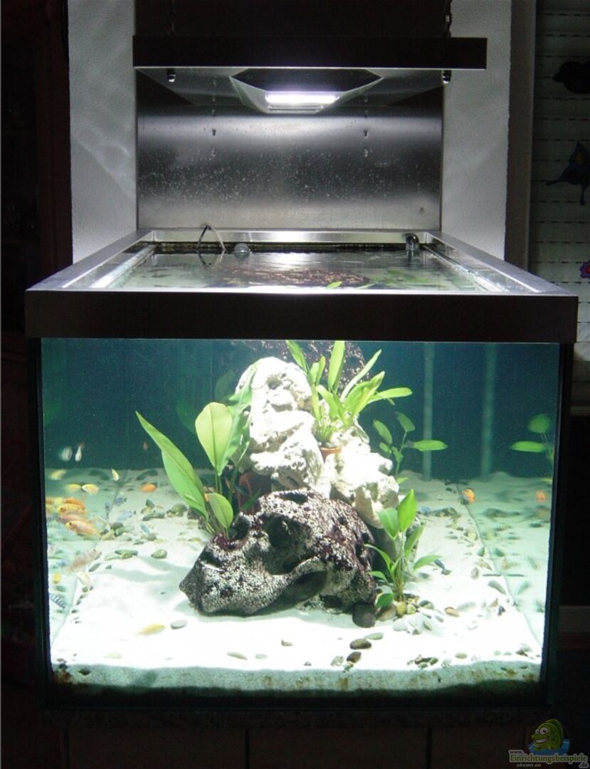 Das Aquarium ist eine Sonderanfertigung und dient als Raumteiler. Der obere Rand des Beckens ist mit einem V4A Edelstahrahmen eingefasst. Als ich 1998 mein Haus baute wurde alles gleich mit eingeplant. Das Becken ist gebohrt und am Hausabfluss und Hauswasseranschluss über eine Thermostatbatterie angeschlossen. Der Schrank ist gemauert und verklingert. ??ber eine Edelstahlklappe ist die Technik zu erreichen.