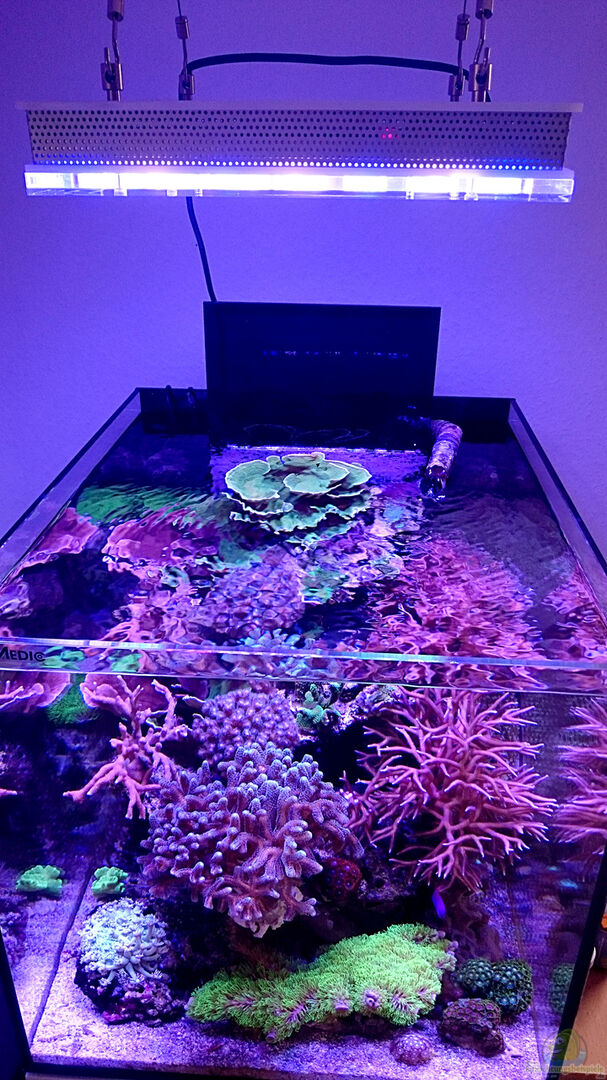 Ich habe das Becken anfänglich nur mit Riffkeramik und den Sangokai Basics gestartet. Die ersten Korallen zogen nach einigen Tagen ein und die meisten SPS nach zwei Wochen. Nach und nach habe ich zur Erweiterung der Biodiversität und für mehr Stellplatz noch etwa 4KG Lebendgestein eingesetzt.
