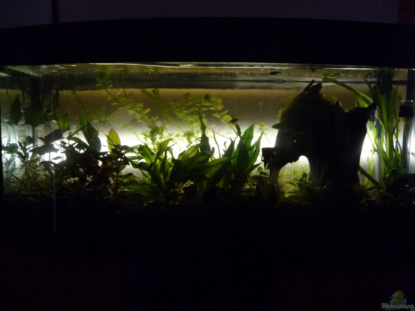 Das Aquarium ist von der Marke Hagen und hat eine Gebogene Frontscheibe (an den seiten 40cm Breit und in der mitte 50cm breit). Die Hintergrundscheibe ist beklebt mit milchiger Folie (ist eigentlich für badezimmer gedacht). Hinterm Aquarium habe ich einen selbstangefertigten Karton geklebt. Im Karton ist eine 1m lange LED-Stripe verbaut. Die LED´s wurden als Nachtlicht eingestezt. !!! Hintergrund wurde gegen Schwarze Folie getauscht, bilder bleiben als Beispiel!!!