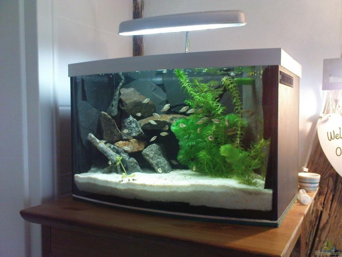 Das Becken dient als Aufzuchtbecken, und nur als Aufzuchtbecken. -----Vorübergehend mit Neolamprologus Brevis besetzt--- Aluminiumleiste an der Oberkante des Beckens sowie Rück- und Seitenwände mit Schieferplatten versehen.