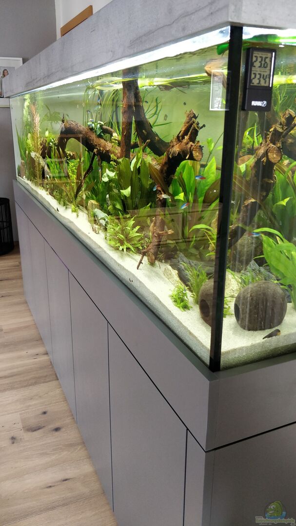 2 x 40 mm Bohrung rechts oben auf der Seite für Ablauf und Notüberlauf, automatischer Wasserwechsel ca 50L täglich, mit Überlauf vom 160L Filterbecken. Unter dem großen Becken ist jetzt ein kleines Aufzuchtbecken. Wird auch über den großen Filter betrieben.