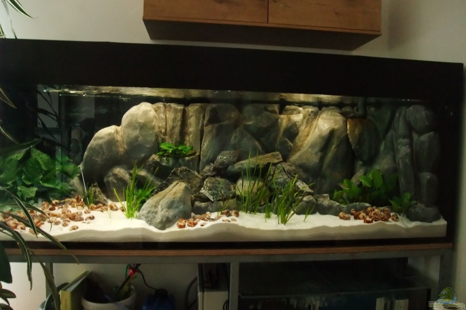 Hinten rechts doppelwandiger ??berlaufschacht mit einstellbarem Kamm für oben und 4 Gitter weiter unten für den Wasseraustausch im Bodenbereich. Bohrungen im Aqua-Boden für Ablauf nach unten und Einlauf zur Wasserrückführung. Aquarium Sto??- und Wulsverklebt. Frontscheibe aus Floatglas. Alle Scheiben sind 12mm dick.