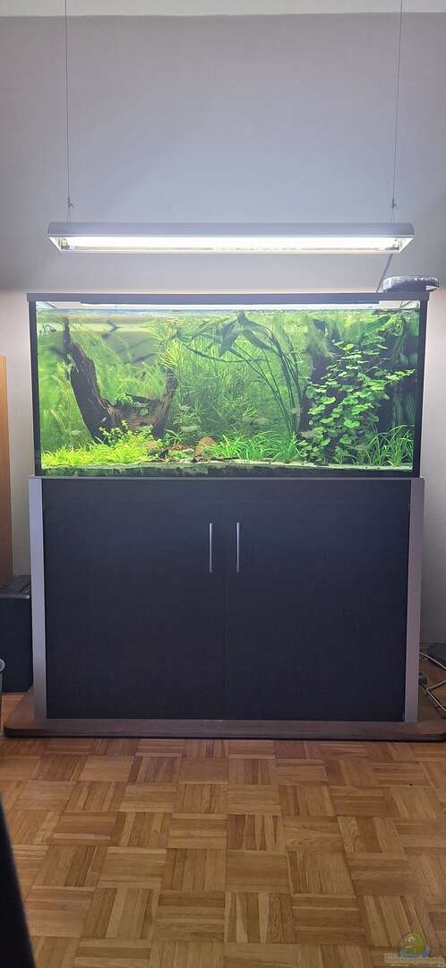 Becken ohne Abdeckung 12mm Floatglas stoßverklebt mit Sicherheitsnaht ohne Querverstrebung, zwei Bodenbohrungen (35mm) hinter HMF für Zu- und Ablauf zu den Außenfiltern Unterschrank Eigenbau aus verkleideten Aluminiumprofilen mit Scherplatten Rückwand: mit Sand und Farbe strukturierte Styropor-Platte von außen