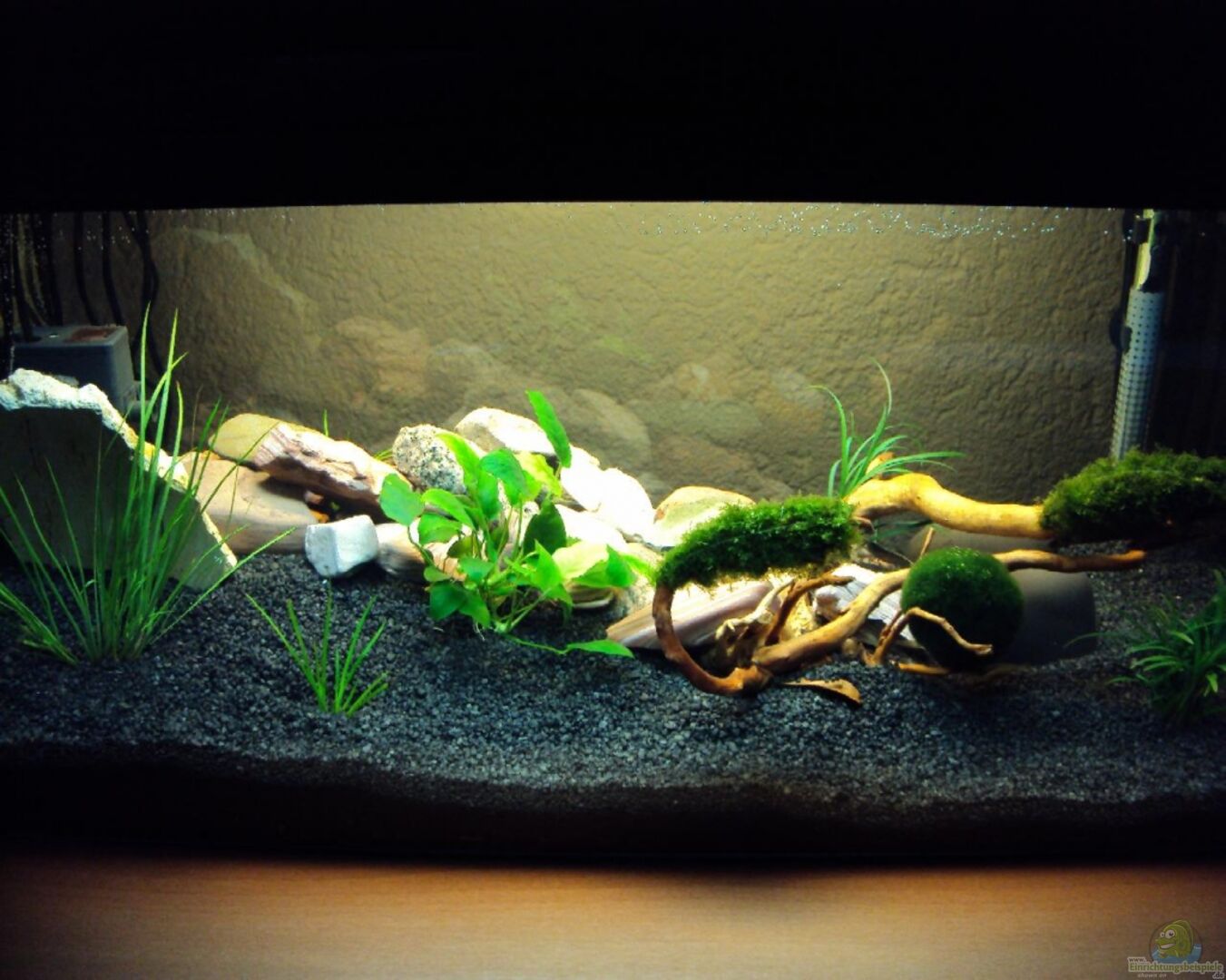 Aquarium läuft seit dem 19.07.2010 MP 96 Liter Aquarium mit Sto??verklebung Das gesamte Becken wurde auf die Bedürfnisse und Ansprüche der Molukkenfächergarnele (Atyopsis moluccensis) eingerichtet und in Betrieb genommen. Da die Garnelen sich in die Strömung stellen und mit ihren Fächern das Wasser filtern, wurden 3 Strömungspumpen installiert.