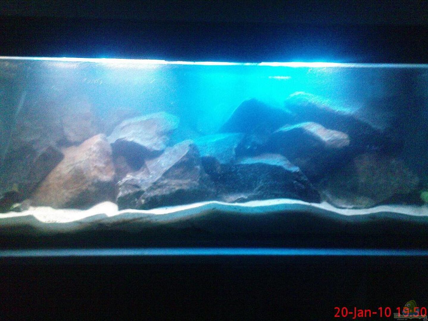 Selbst gebauter Schrank auf Profilrohren; Selbst gebaute Aquarienabdeckung; Als ausgleich des Gewichts wurde das Becken unter dem Kies mit 30mm Styroporplatten ausgelegt.Es verhindert ein untergraben der Steine.