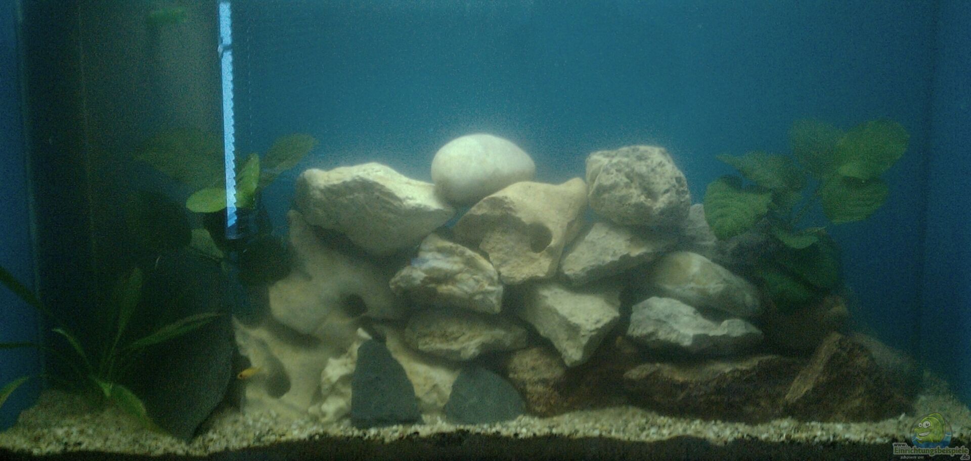 Becken ist Teil eines Aquarienschrankes (Sonderanfertigung), das aus einem 200 l Becken (oben) und einem 220 l Becken (unten) besteht. Die Blenden über den Becken sind magnetisch, die Rück- sowie Seitenwände beider Becken sind mit blauer Farbe bestrichen.