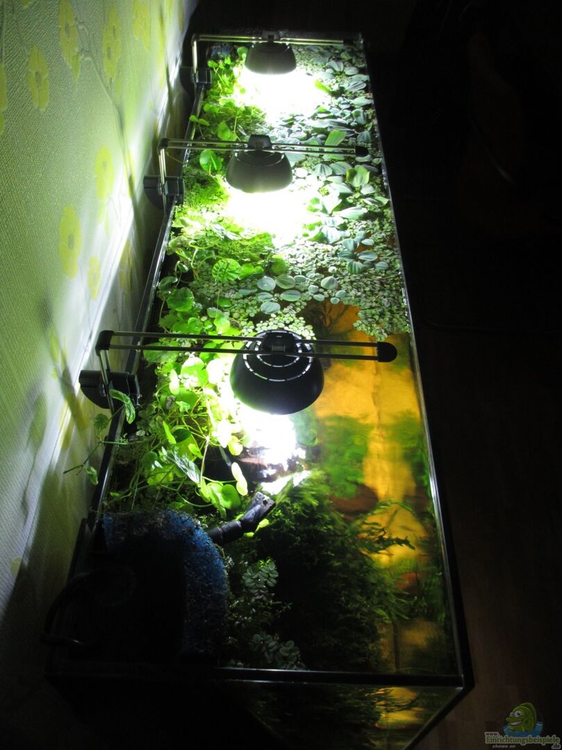Eingeklebte Terasse aus Plexiglas mit Lavasteinen beklebt. Algenbälle aufgerollt mit Saugnäpfen an der Beckenrückwand befestigt. Holz-Seitenteile, gebeizt als Sichtblende Mangrovenholz an die Rückwand silikoniert und bepflanzt
