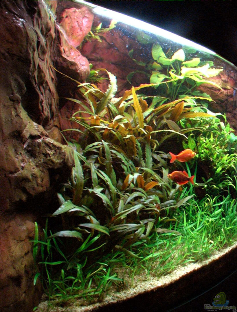 Eckaquarium mit leicht gewölbter Frontscheibe Eigenbau-Rückwand (Styropor, Aquarienzement, Airbrush, Epoxidharz)